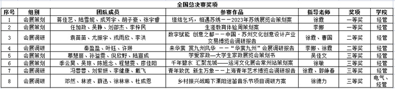 经过评审,公司获得最佳院校组织奖,国赛一等奖2项、二等奖2项、三等奖4项。其中由公司经济管理公司徐霞老师指导,扬帆队参赛队员蒋佳艺、陆雪妮、成芳宇、胡子豪、张宇睿的参赛作品《缘结乞巧,相遇苏绣——2023年苏绣展览会策划案》以分组赛小组第一的成绩入围27日的全国精英赛,最终荣获全国总决赛一等奖,并获得赴新加坡参加全球总决赛的资格。