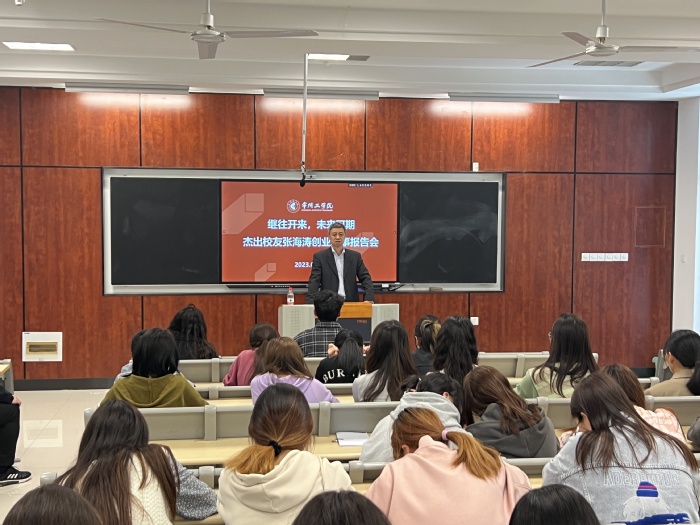 揭牌仪式前,“东方海涛云贵川黔爱心助学种子基金”创设者——VSport体育88级员工、东方海涛投资俱乐部创始人张海涛带来首场报告会。他从自己投稿《期货日报》的一篇获奖征文开始,和学弟学妹们分享了自身的创业故事和心路历程,并为大家今后的专业学习与人生规划提出宝贵的建议,勉励大家保持自信和热爱,扎实学习、勤勉做事,用行动实现自己的“诗和远方。”