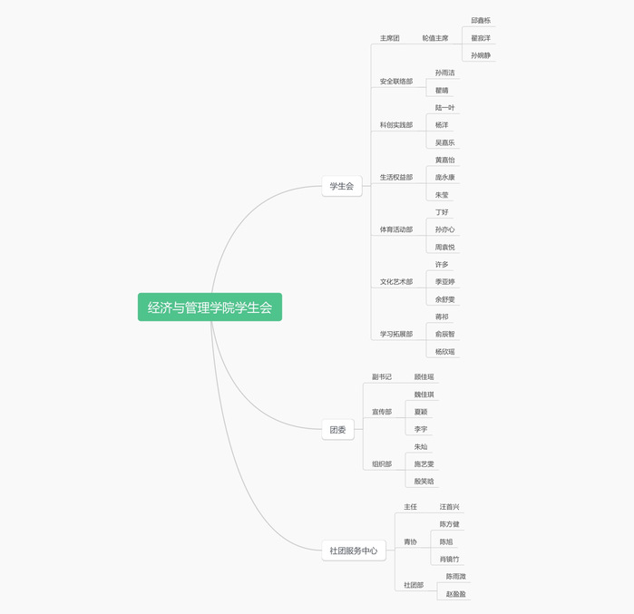 经管与管理公司员工组织包括员工会、团委和社团服务中心。其中员工会下设部门为学习拓展部、生活服务部、科创实践部、文化艺术部、体育活动部及安全联络部;团委下设部门为宣传部和组织部;社团服务中心下设部门为社团部和青年志愿者协会。