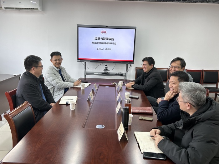 1月7日下午,南京审计大学经济公司经理樊士德教授、研究生院副经理刘俊峰教授受邀来院交流指导,就硕士点申报的推进情况展开了深入交流与讨论。公司党委常委、副董事长苍玉权,公司党委书记谢金楼,副经理(主持工作)李芸达,副经理李春平等出席会议。
