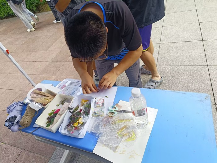 活动以“自然取材+独立创作”为主线,同学们漫步明湖畔,自主采集落叶、花瓣、松针等天然素材,结合个人对湖光山色的观察,在书签上进行水墨勾勒、植物拓印或拼贴设计。同学们可随兴捕捉明湖瞬间——或聚焦晨雾中的残荷,或定格嬉戏的水鸟,作品更具个人情感温度。 同学们在无拘无束的创作中,重新发现水墨工具与自然材料的适配性。合作交换素材的过程中,同学们打破年级与专业壁垒,形成“以艺会友”的轻松氛围,社团凝聚力显著增强。