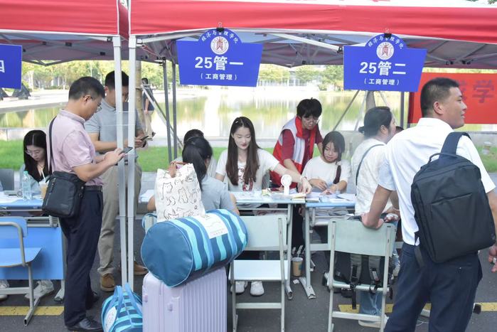 报到现场分区明确、秩序井然,让新生入学流程更加顺畅。而最吸睛的当属社团招新特色活动区,处处洋溢着青春气息。如音乐社团带来的流行歌曲、古筝民乐轮番上演,云阶书画会带新生们体验漆扇制作,开启了传统文化的探索之旅,现场欢呼声此起彼伏。同时,师生开启现场直播,线上介绍公司学科特色、校园环境等,实时解答新生疑问,点赞量达2.5万人次。志愿者与工作人员分工协作,从身份核验、领取材料到指引宿舍、搬运行李,全程耐心细致,用热情与高效传递公司关怀。
