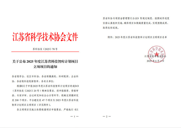 2025 年度江苏省科技智库计划项目遴选结果公布,公司申报的 2025 年江苏省科技智库计划(智库)平台项目成功获批。